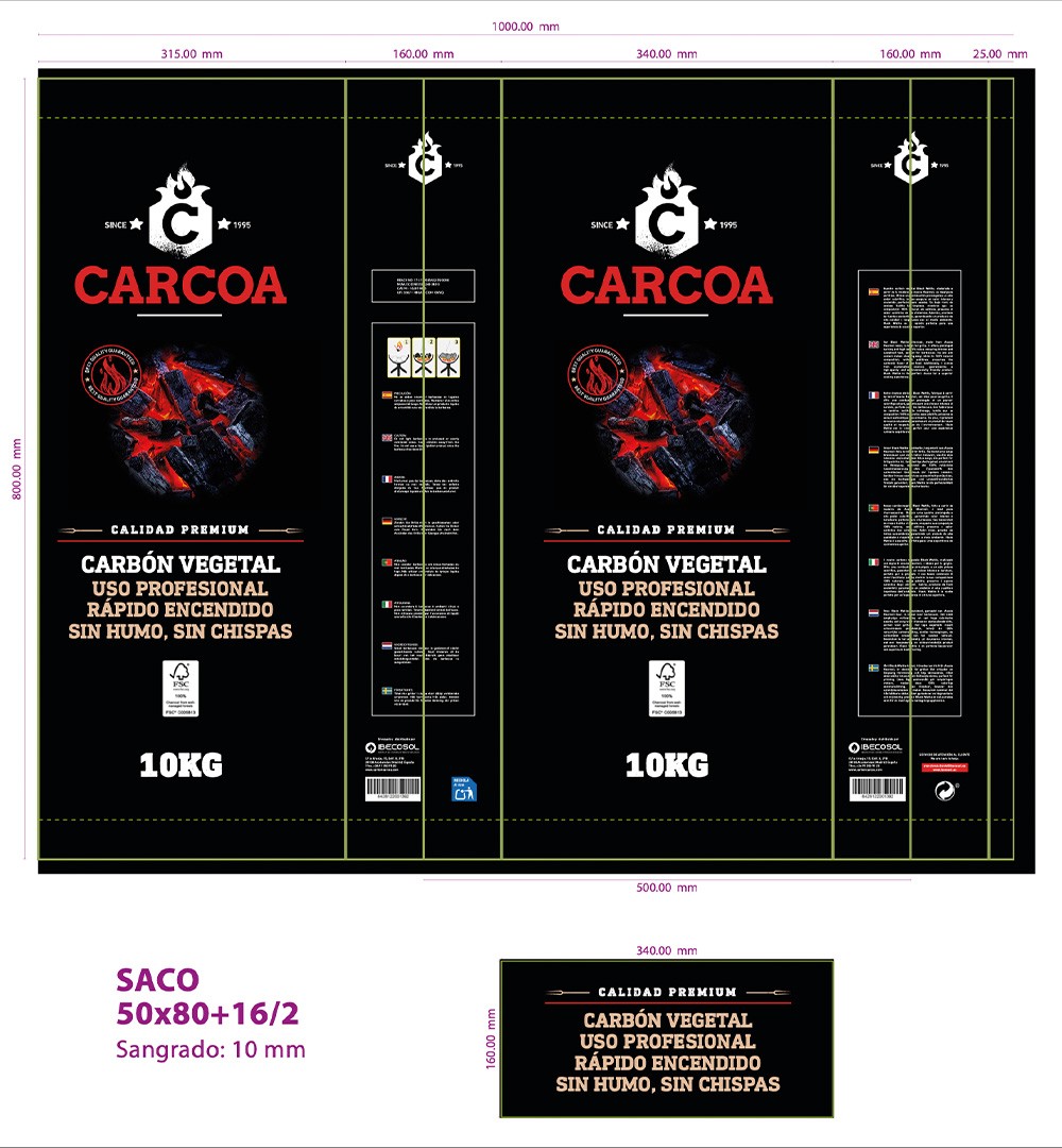 Con este proyecto abarcamos el diseño de packaging, aplicado en este caso a una bolsa de carbón vegetal de 80 cm de alto.