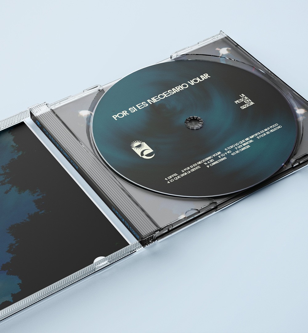 Desarrollamos el arte de su primer disco “Por Si Es Necesario Volar” (2025), con aplicaciones para plataformas digitales y formato físico en CD, incluyendo el diseño del libreto.